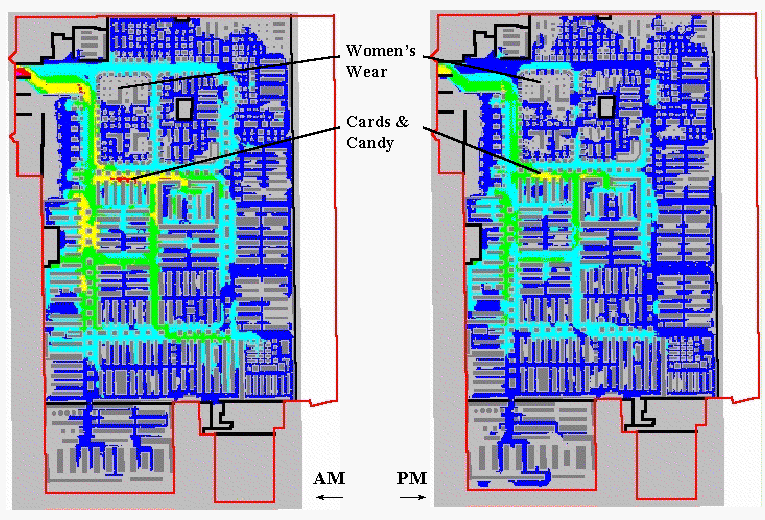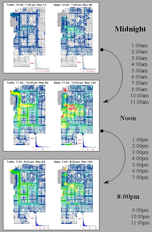 Figure 1. Snapshots from a movie of hourly maps of shopper movement and sales