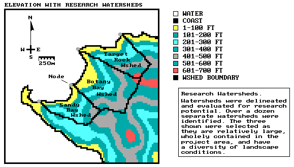 The characterization of the Research Areas Model first used the elevation map to identify individual watersheds.  The set of all watersheds was narrowed to just three based on scientists' requirements that they be relatively large and wholly contained areas (Figure 2).  A sub-model used the prevailing current to identify coastal areas influenced by each of the three terrestrial research areas.