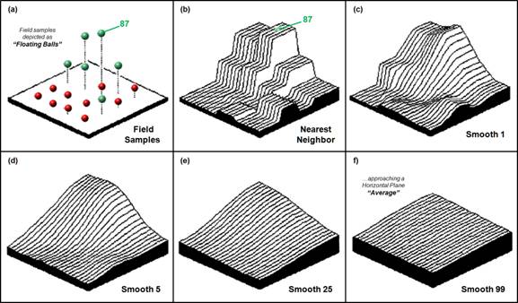 Figure 2 shows a different approach to fitting a surface to our data iteratively smoothed.  Consider the top series of insets. Imagine replacing the floating balls (insert a) with columns of modeler's clay rising to the same height as each ball (insert b).  In effect you have made a first order guess of the animal activity throughout the project area by assigning the map value of the closest field sample.  In techy terms, you generated Thessian polygons, with sharp boundaries locating the perpendicular bisectors among neighboring samples.