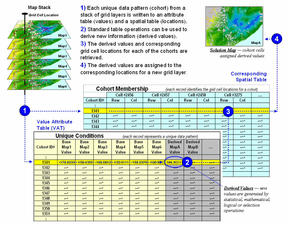 Figure 2 depicts a natural extension of the procedure involving two tables—a Value Attribute Table and a Cohort Membership Table.  For example, given grid layers for travel-time for six stores classified into proximity classes (1= close, 2, 3 and 4= far) results in 4096 possible combinations.  Each combination, in turn, forms a single record (row) in the Value Attribute Table (VAT) file.  The record contains a unique cohort ID number and a field (column) for each of the base map conditions (figure 2, step 1).  The user can operate on this table to derive new information, such as the minimum travel-time to the closest store, which is appended as a new field (step 2).