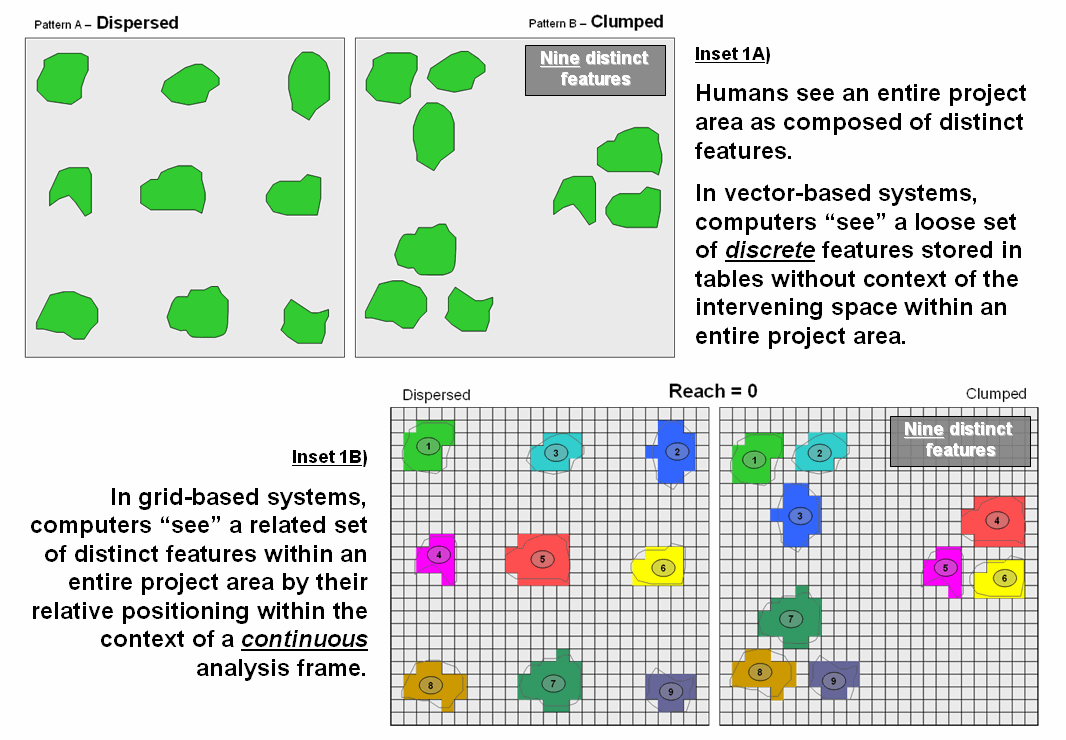 Since vector-based systems store features as a loose set of discrete entities in a spatial table, the computer is unable to “see” the entire spatial pattern and interveening geographic space.  Grid-based systems, on the other hand, store an entire project area as an analysis frame including the spaces.  Inset 1B represents the individual features as a collection of grid cells.  Adjacent grid cells have the same stored value to uniquely identify each of the individual features (1 through 9 in this case).  Note that both patterns in the figure have nine distinct grid features—it’s the arrangement of the features in geographic space that establishes the Dispersed and Clumped patterns.