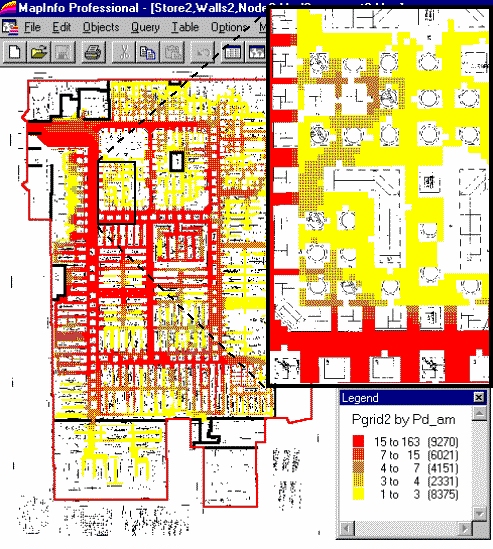 Movement within a store is conceptually similar, but the geographic factors and basic approach are different. The analysis scale collapses from miles along a road network, to feet through a maze of aisles and fixtures. Since the rules of the road and fixed widths of pavement dont exist, shoppers move through capricious routes. This complexity of movement suggests that surface analysis (raster) is more appropriate than the traditional network analysis (vector) for modeling in-store movement, sales densities and statistical analysis among maps.