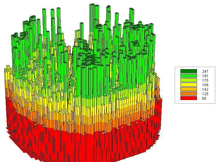 Composite Display of Yield Variability. This plot shows the histogram of the data, 2-D Grid display, 3-D Extruded grid display and the assignment colors and statistics for a 3 interval classification.