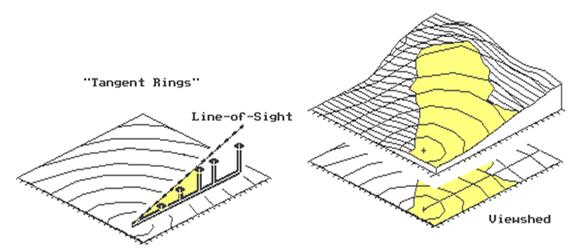 It is just what your machine likes-- neat organization.  The ripple number implicitly tracks of the horizontal distance.  The elevations are identified by the column and row designation of current ripple's set of cells.  The tangents to be beat are identified by cell positions of the previous ripple.  "Splash," followed by a series of rippling waves carry the tangents to be beat, while the visible locations are marked in their wake.  The effects of haze can be introduced by only rippling so far, or adding a visual fall-off weight, such as "inverse distance squared."  The lower map in the right portion of Figure 1 is a planimetric plot of the viewshed of the same point described above.  For reference, the line-of-sight is traced on the planimetric map.  The map on top, drapes the viewshed on the elevation surface.  Note that the line-of-sight shading of visible locations continues up the side of the mountain until the inflection point (ridge top) at the reference ring.