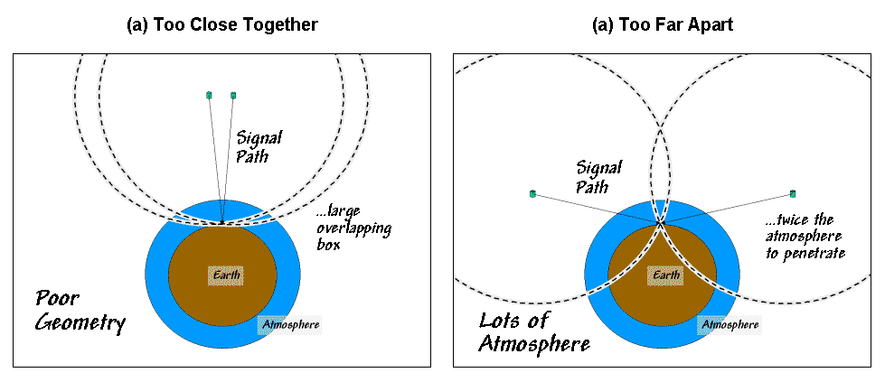 point of intersection. If the satellites are too far apart, the increased atmosphere