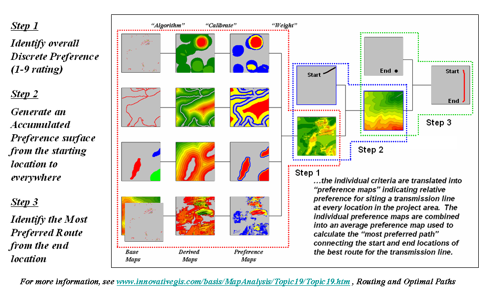The use of the Least Cost Path (LCP) procedure for identifying an optimal route based on user-defined criteria has been used extensively in GIS applications for siting linear features and corridors. Whether applications involve movement of elk herds, herds of shoppers, or locating highways, pipelines or electric transmission lines, the procedure is fundamentally the same— 1) develop a discrete cost surface that indicates the relative preference for routing at every location in a project area, 2) generate an accumulated cost surface characterizing the optimal connectivity from a starting location (point, line or area) to all other locations based on the intervening relative preferences, and 3) identify the path of least resistance (steepest downhill path) from a desired end location along the accumulated surface. See Author’s Note 1 for more information on applying LCP to routing applications.