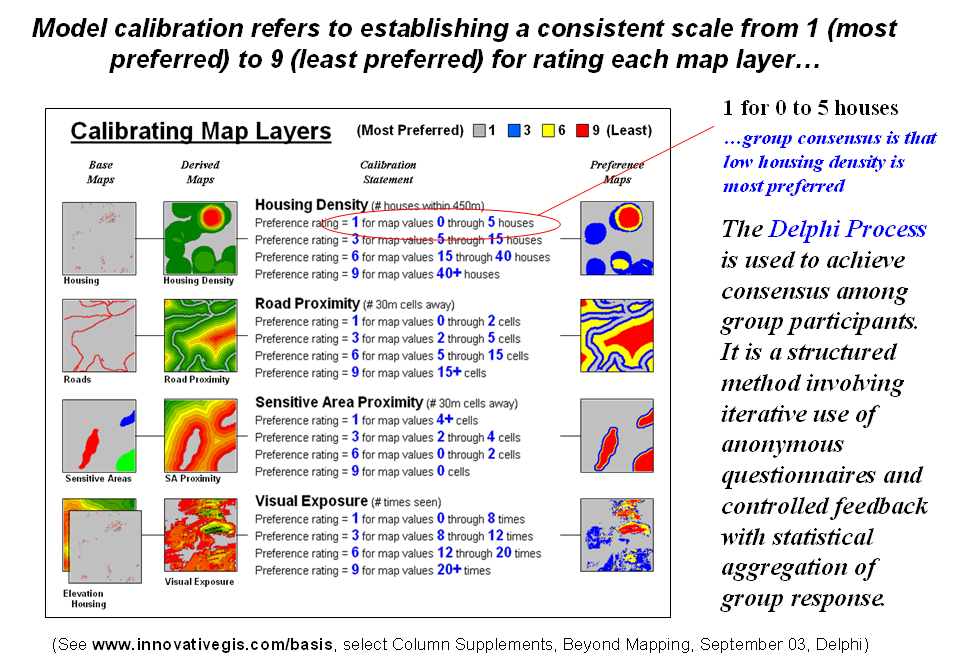 The Delphi Process, developed in the 1950s by the Rand Corporation, is designed to achieve consensus among a group of experts. It involves directed group interaction consisting of at least three rounds. The first round is completely unstructured, asking participants to express any opinions they have on calibrating the map layers in question. In the next round the participants complete a questionnaire designed to rank the criteria from 1 to 9. In the third round participants re-rank the criteria based on a statistical summary of the questionnaires. “Outlier” opinions are discussed and consensus sought.