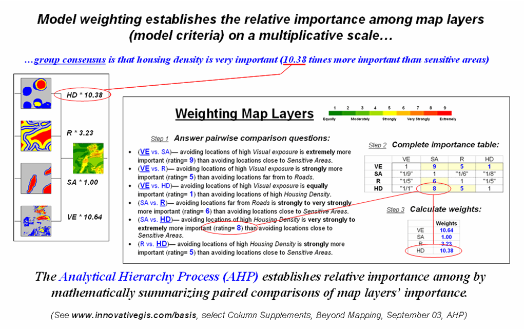 Weighting of the map layers is achieved using a portion of the Analytical Hierarchy Process (AHP) developed in the early 1980s as a systematic method for comparing decision criteria. The procedure involves mathematically summarizing paired comparisons of the relative importance of the map layers. The result is a set map layer weights that serves as input to a GIS model.