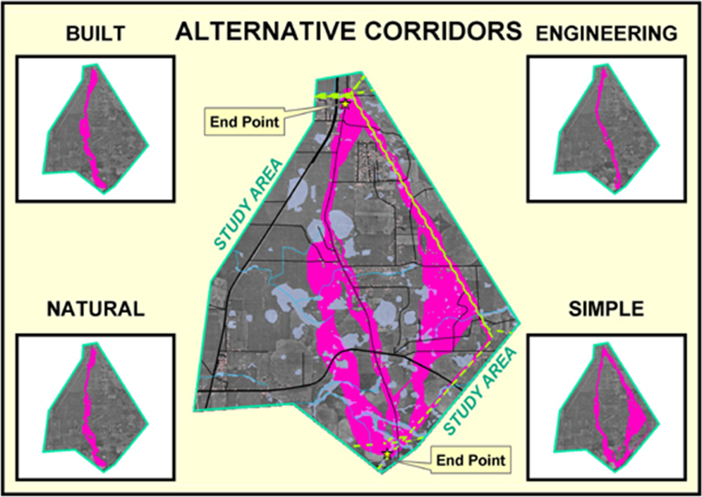 1) The online book Map Analysis, Topic 19, “Optimal Paths and Routing” presents a detailed discussion on the Least Cost Path procedure for GIS-based identifying optimal routes and corridors. See…