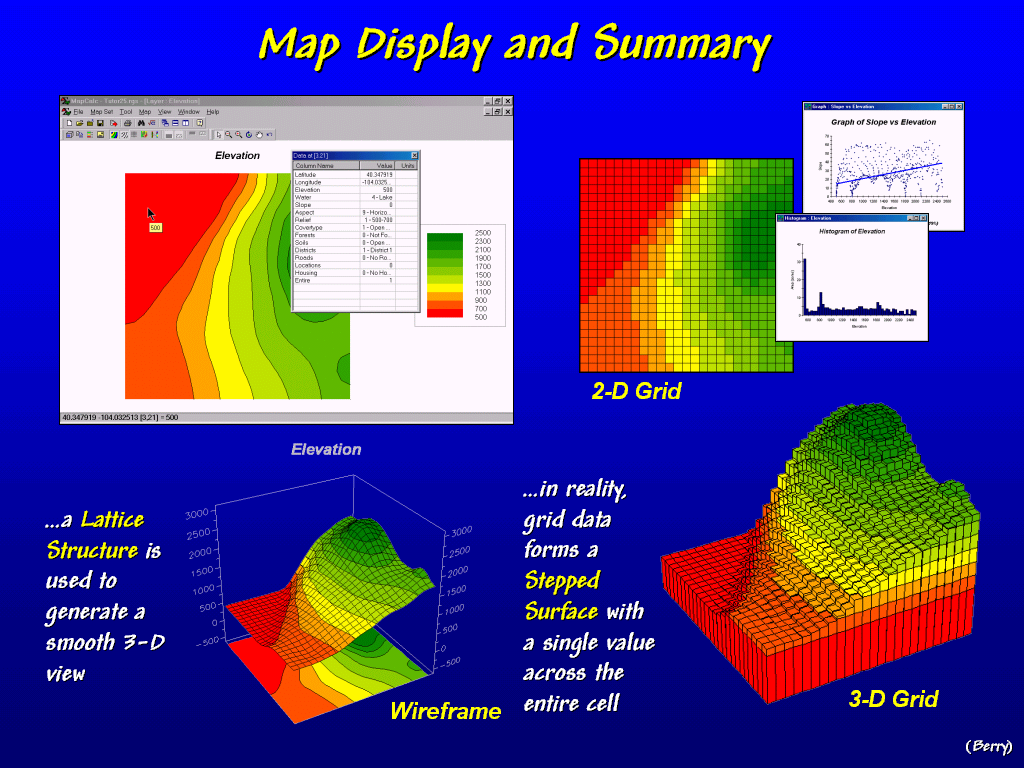 Vector displays provide smoothed renderings of map surfaces while grid displays show the actual appearance of the stored data. Summary statistics and charts, such as histograms and scatterplots, are easily generated from grid data.